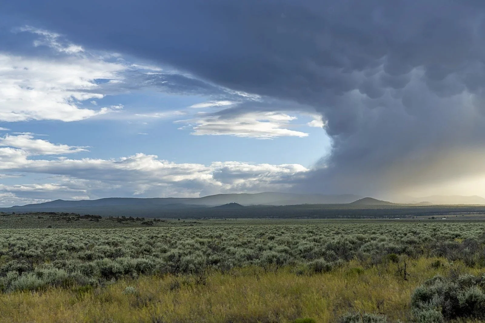 A vast sagebrush plain stretches beneath a dramatic sky where a dense, dark storm cloud looms over the distant hills.