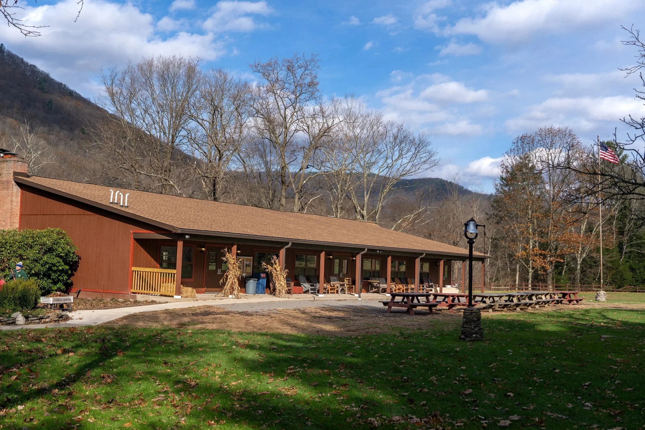 A long, red-sided building with a covered porch stands in a clearing, flanked by bare trees and rolling hills under a partly cloudy sky.